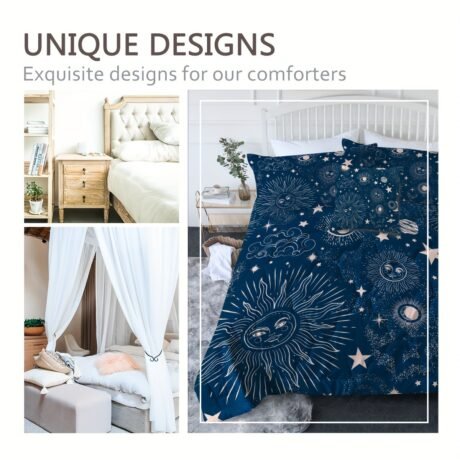4-Piece Celestial Comforter Set – Soft Quilted Bedding with Vibrant Sun, Moon, and Star Pattern – Boho Mandala Design, Blue Color, Comfortable and Cozy for a Relaxing Sleep Experience