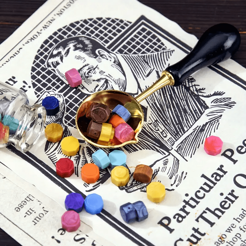 Complete Wax Sealing Set: Includes a handle stamp. wax particles. a melting spoon. and a round wax in a golden tin for creating elegant wax seals.