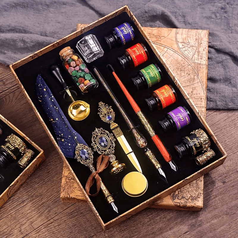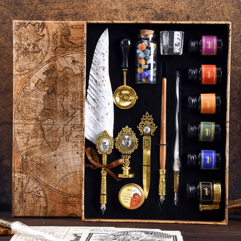 Essential Accessories: Comes with a letter opener. six bottles of ink. a wooden dipping pen. a glass cleaning cup. and a metal pen holder.